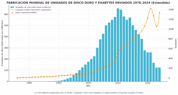 Y para acabar aquí tenéis la gráfica que os paso todos los años sobre el PEAK MEMORY. He actualizado los datos de producción de petróleo y sigo poniendo un descenso para los próximos años, pero de eso yo no puedo mas que opinar pues será la realidad la que nos vaya contando la historia. No obstante parece que llegamos a los 100 millones de barriles diarios en 2024-2025 y mientras tanto la memoria digital subió pero como podéis observar sin llegar a los máximos de 2022. Todo sigue dentro de mis predicciones a diferencia una vez mas de la de los expertos y pasamos de estar entre el peor escenario y el moderado a entre el moderado y el optimista, todos por supuesto dentro de el PEAK MEMORY predicho en 2019. Veremos que tal acaba 2025 y como va 2026, pero por ahora sigo estando en lo cierto y el almacenamiento digital no subió como la espuma como predecían los expertos. Esta siendo una década WTF muy curiosona y la IA esta añadiendo mas variables a todo que son muy interesantes y de las que tal vez hable en el futuro.